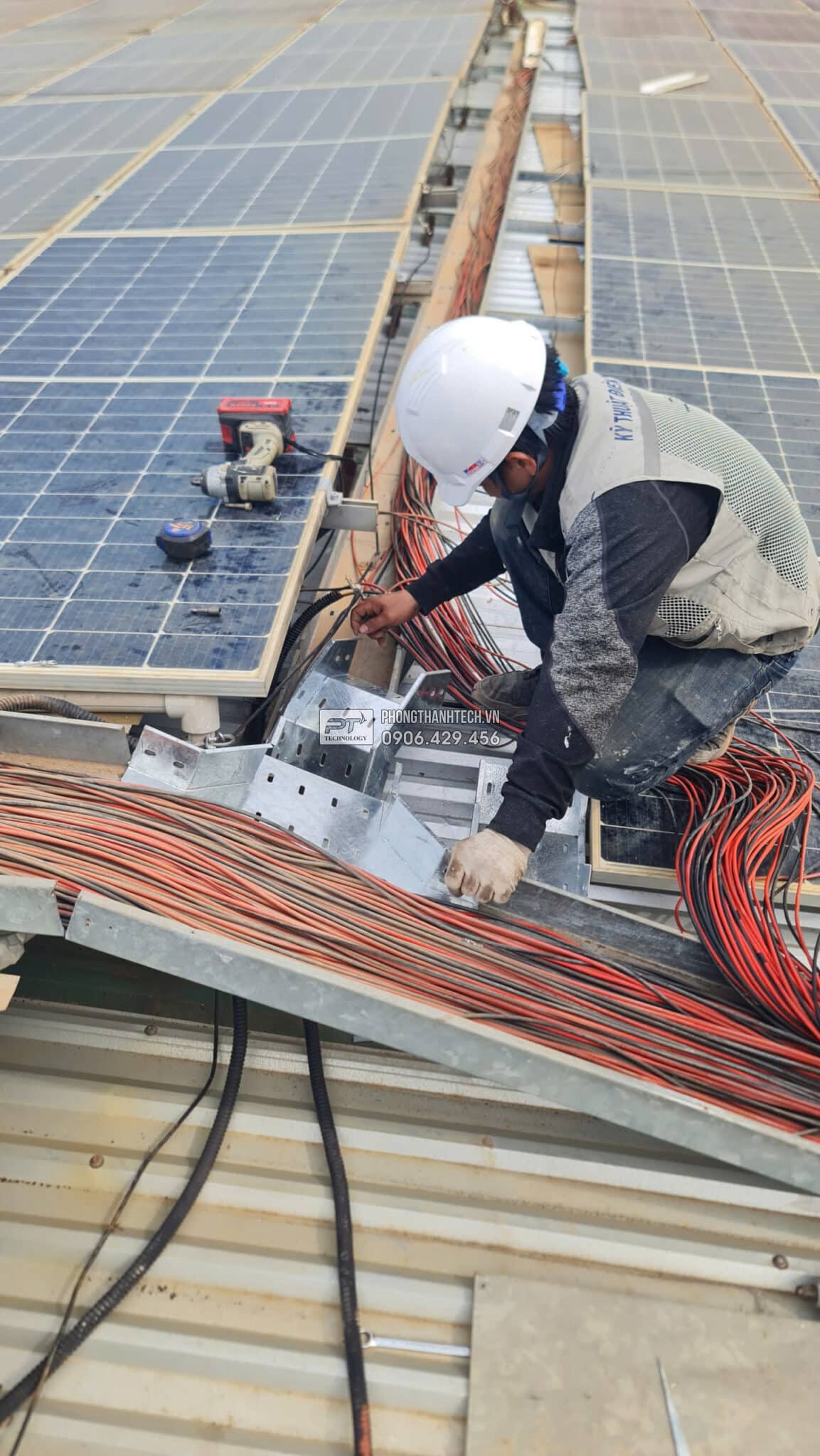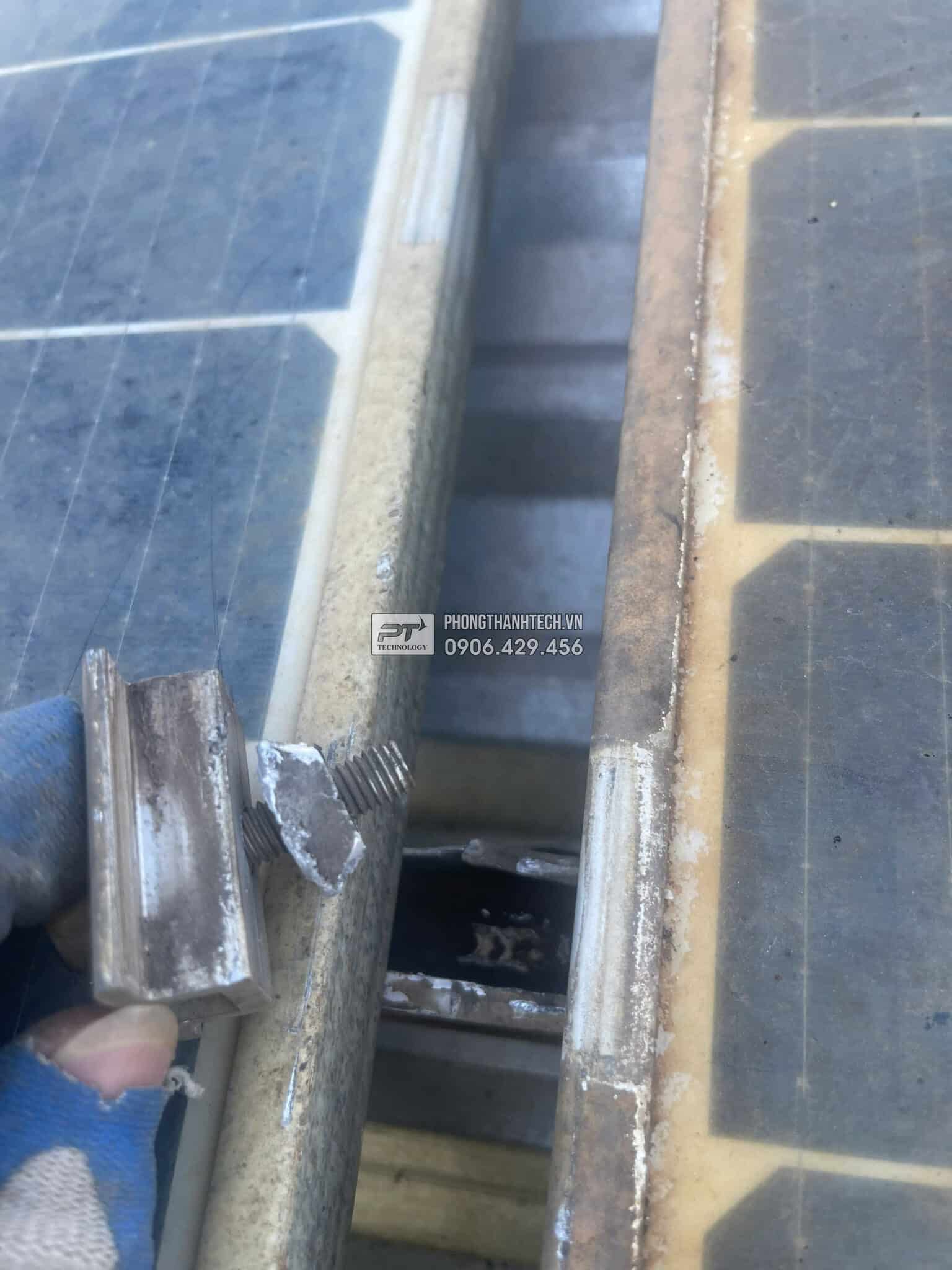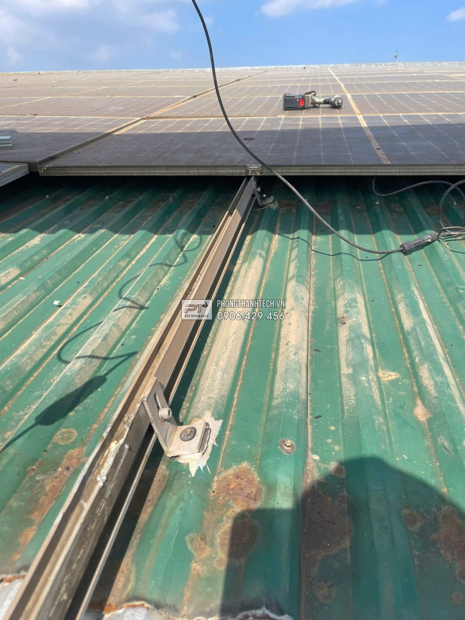 Ngày 5,6,7,8: Thay thế hộp nhựa bằng tray cable DC nhúng nóng, tầm soát tấm PV, End Clamp, Mid Clamp, sắp xếp chỉnh sửa PV string, dây dẫn DC, sửa chữa hạ tầng điện trên mái.