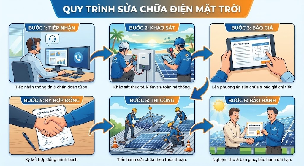 Phong Thành Tech áp dụng quy trình sửa chữa solar Quảng Ngãi minh bạch để khách hàng hoàn toàn yên tâm, gồm:
